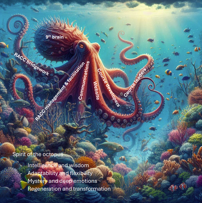 The course community is organized like an octopus. An octopus does not have a single executive brain, gathering and processing all the sensory information and sending out commands to the eyes and tentacles. Each of the eight tentacles has its own brain, and each tentacle senses, decides, and moves independently. There is a brain in the central head, but there are more neurons in the tentacles than in the central brain.